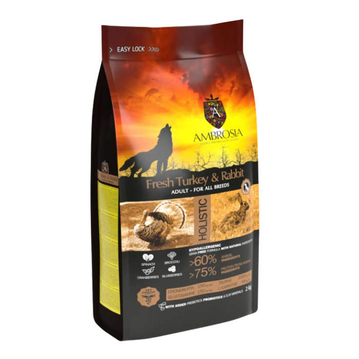 Ambrosia este o hrană superioară, fără cereale, ce oferă nutriție optimă pentru toți câinii. Rețeta cu curcan & iepure va fi pe placul chiar și celor mai pretențioși câini.