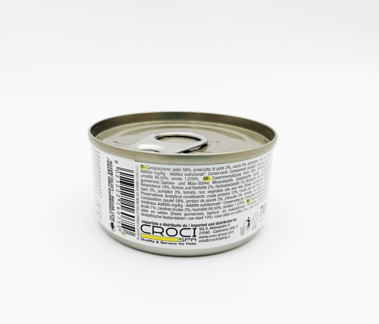 Ingrediente: pui 58%, sunca de pui 3%, dovleac 3%, rosii, orez, uleiuri si grasimi vegetale, amidon de porumb, minerale.