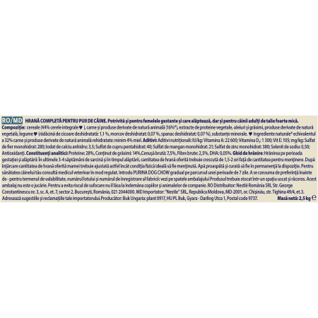 Adulmecarea, urmarirea si explorarea - totul este nou pentru puiul tau de caine, iar cresterea este o munca grea! De aceea, hrana noastra PURINA DOG CHOW adaptata nevoilor puilor de caine include antioxidanti care sustin apararea naturala a organismului si DHA, care este esential pentru cresterea acestora. in plus, este formulata cu ingrediente naturale selectionate si prebiotice naturale pentru a sustine sanatatea digestiva, astfel incat puiul tau de caine este pregatit in fiecare zi sa exploreze lumea. si toate acestea fara a contine coloranti artificiali, arome artificiale sau conservanti adaugati.