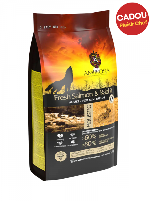 Ambrosia cu Somon Proaspăt și Iepure este o hrană superpremium, fără cereale, ce oferă nutriție completă și echilibrată pentru toți câinii de rasă mică.