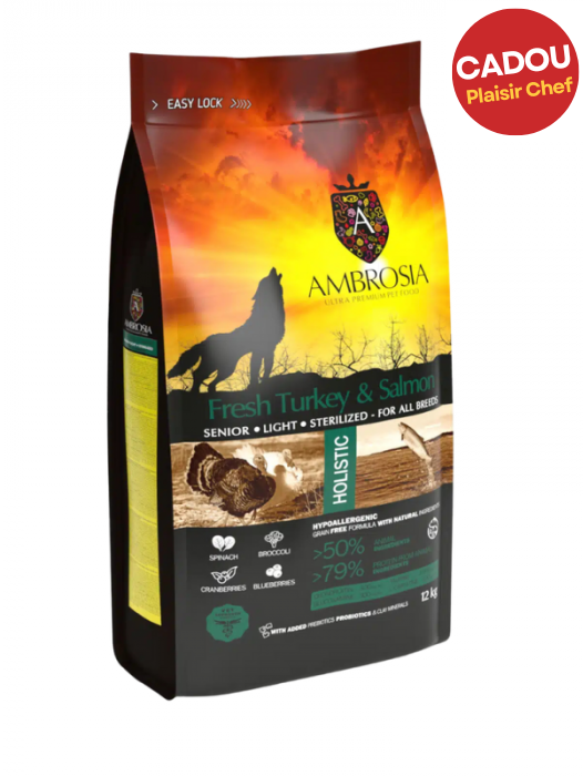 Rețeta Ambrosia cu Curcan Proaspăt și Somon este special concepută pentru câinii seniori, supraponderali sau sterilizați. Aceasta menține un nivel ridicat de proteine provenite din carne proaspătă de curcan și somon, are un conținut optim de grăsimi și este bogată în acizi grași Omega 3 și Omega 6.