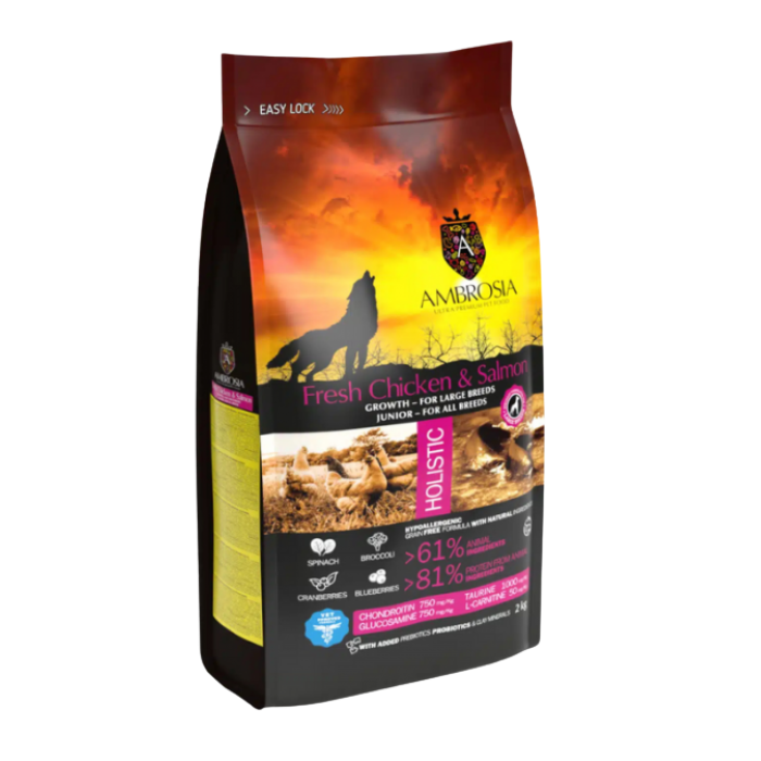 Rețeta Ambrosia cu Pui proaspăt și somon pentru rase mari conține crochete de dimensiune medie și combină pui proaspăt cu somon deshidratat, fructe și legume atent selecționate. Conținutul ridicat de glucozamină și condroitină susține dezvoltarea sănătoasă a articulațiilor, iar prebioticele și probioticele îmbunătățesc digestia și imunitatea. Este o hrană super-premium fără cereale, potrivită pentru toate rasele.