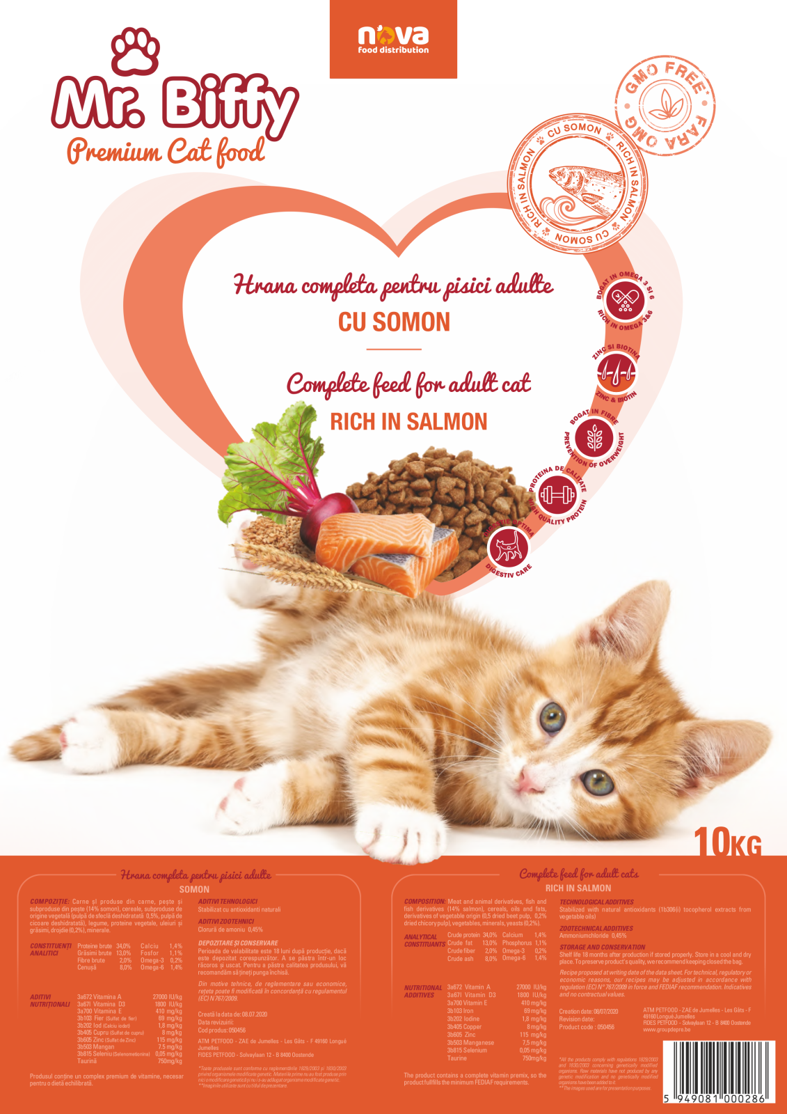 Compozitie: Carne si produse din carne, peste si subproduse din peste (14% somon), cereale, subproduse de origine vegetala (pulpa de sfecla deshidratata 0,5%, pulpa de cicoare deshidratata), legume, proteine vegetale, uleiuri si grasimi, drojdie (0,2%), minerale.